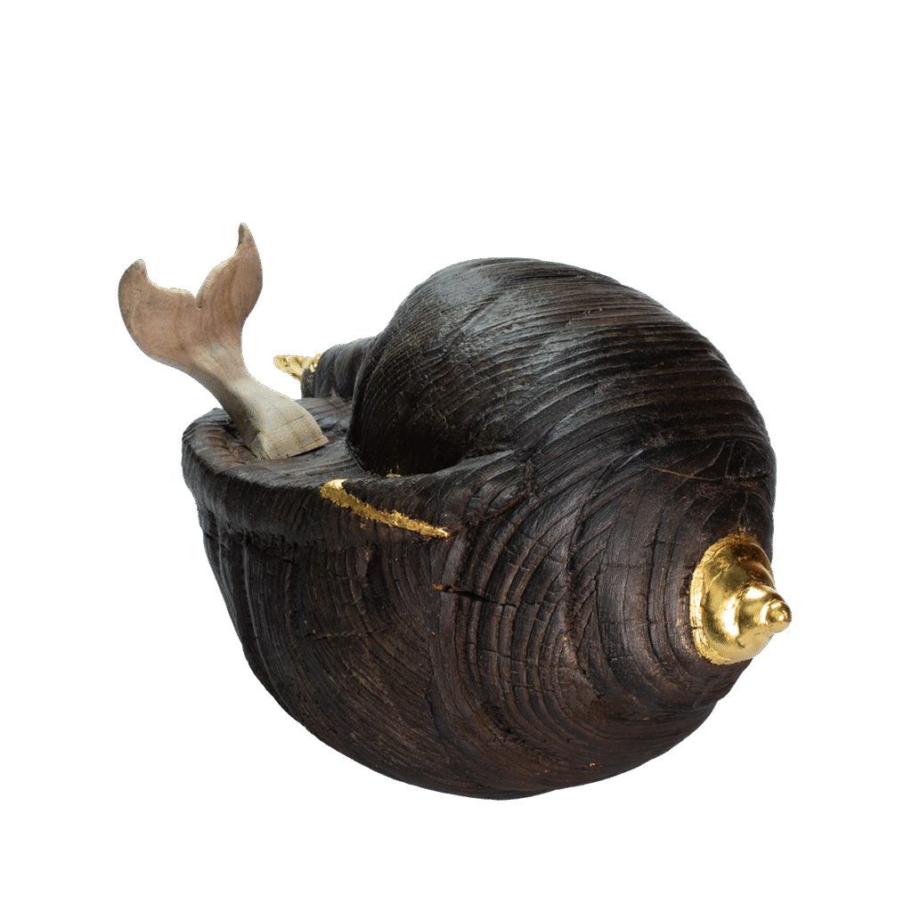 Een dag later belde ze. “Ik zocht op internet naar een schelp voor mijn verzameling. Ineens dacht ik: Jan! Zou jij uit dat verbrande hout een schelp kunnen snijden? Met een gouden puntje?”