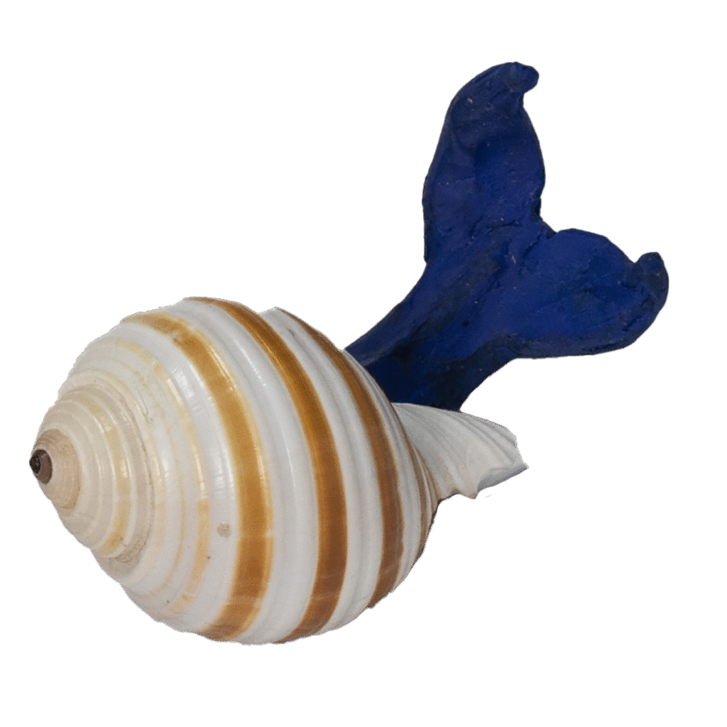 En het voorbeeld voor de staart in blauwe plastiline liet ik in de echte schelp zakken. Wat een prachtig lijnenspel opleverde, alsof de staart de tekening van de schelp volgde. Hoe zou zo’n combinatie eruitzien in een bronzen uitvoering? Dat wordt misschien een volgende ontdekkingsreis.