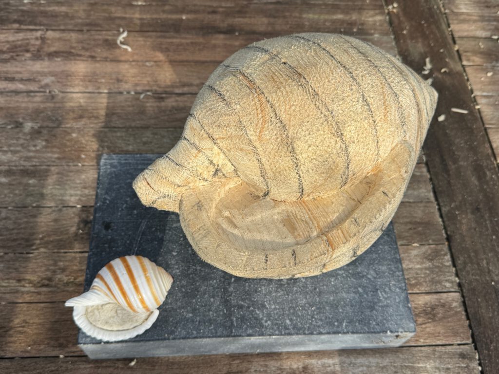 Holy Shell, uitgehakt in hout naar het voorbeeld van een echte schelp van 9 centimeter.