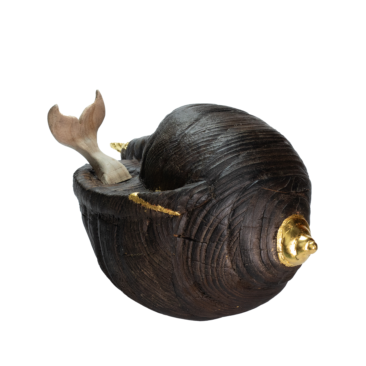 Een dag later belde ze. “Ik zocht op internet naar een schelp voor mijn verzameling. Ineens dacht ik: Jan! Zou jij uit dat verbrande hout een schelp kunnen snijden? Met een gouden puntje?”