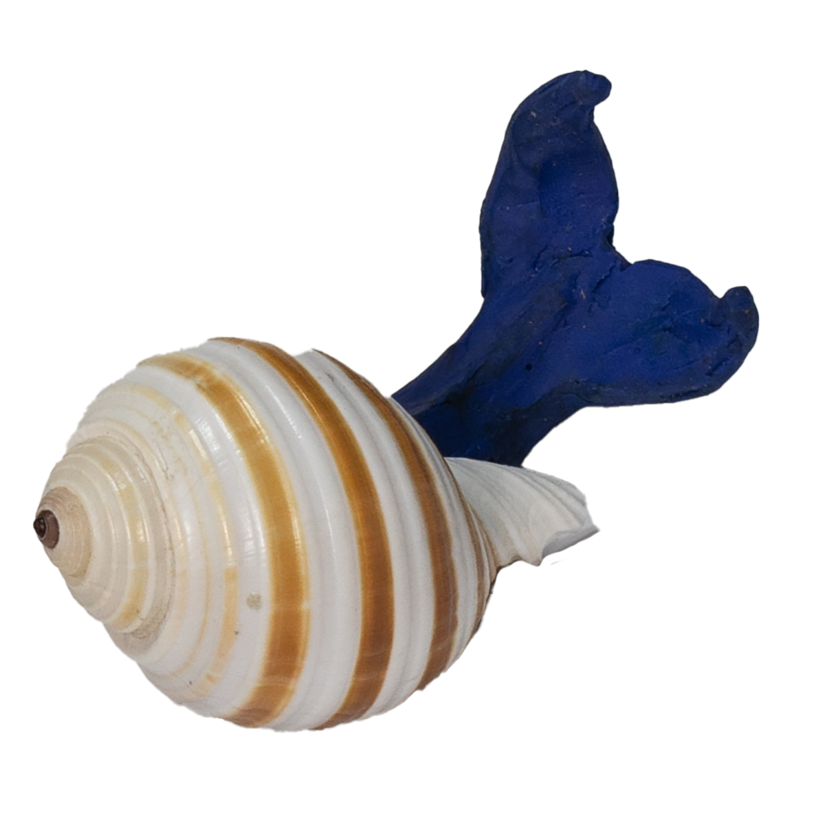 En het voorbeeld voor de staart in blauwe plastiline liet ik in de echte schelp zakken. Wat een prachtig lijnenspel opleverde, alsof de staart de tekening van de schelp volgde. Hoe zou zo’n combinatie eruitzien in een bronzen uitvoering? Dat wordt misschien een volgende ontdekkingsreis.