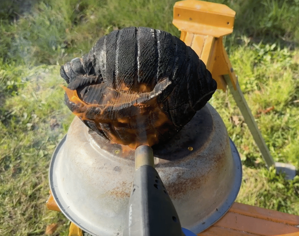 Het met de gasbrander bewerken van vurenhout is spectaculair: de schelp verandert in een kolkende klomp vuur. Afgekoeld blijft een rokend blok haardhout over. Wat zou er onder dat blinkende zwart zitten? Professioneel mondkapje op. Afschuren maar, met een zacht koperen borsteltje. En maar hopen dat het gaat lijken op een verweerd chalet in de Alpen; donkerbruin gebrand door zon, sneeuw, vorst, regen en de jaren. Ik denk nog steeds met heimwee terug aan de manier waarop deze planken verwerkt zijn in Villa Calluna in Zuid-Tirol.