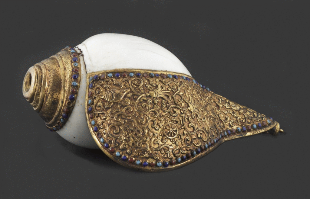 Door Tibetaanse monniken bewerkte rituele schelp (ca. 1750-1850), nu in het bezit van het Seattle Art Museum.