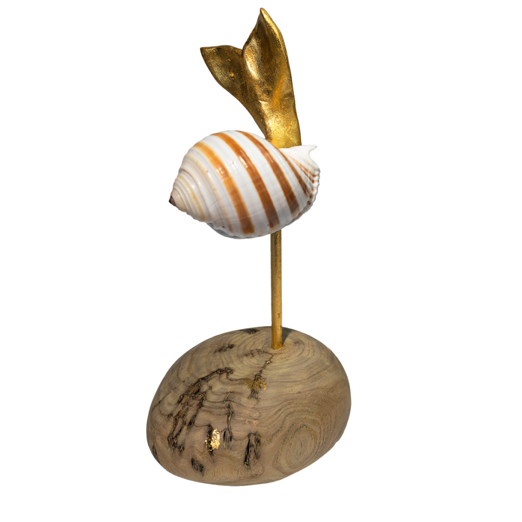 Ik probeerde die beweging van die duikende staart te versterken door de lijn door te trekken in een tropische schelp, de Tonna sulcosa. Ook al zo’n wonder van de natuur. De staart sneed ik uit lindehout, dat ik verguldde. De voet van catalpa-hout (’trompetboom’) is geïnspireerd op de gladgeschuurde keien die daar in Canada op het strand aanspoelden.