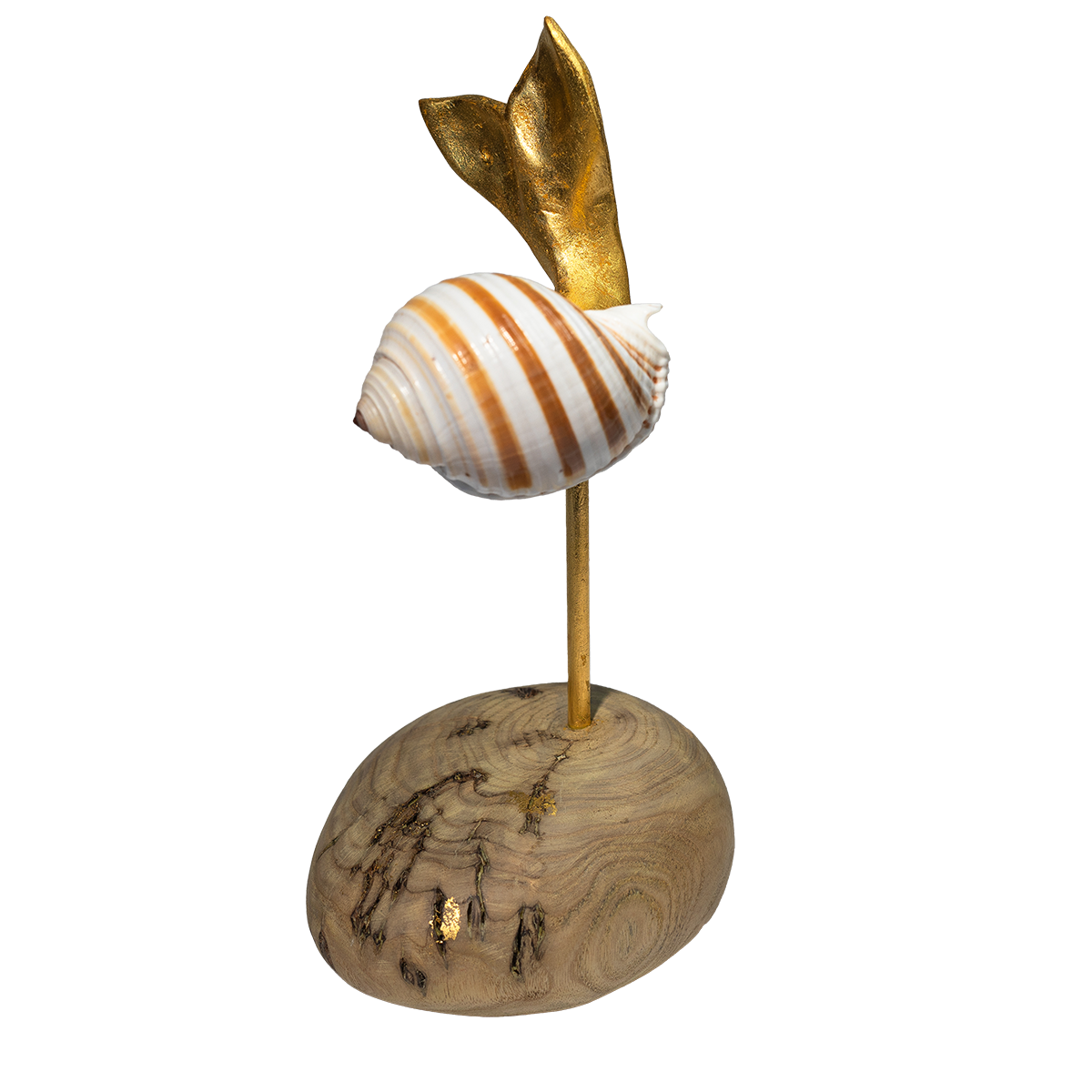 Ik probeerde die beweging van die duikende staart te versterken door de lijn door te trekken in een tropische schelp, de Tonna sulcosa. Ook al zo’n wonder van de natuur. De staart sneed ik uit lindehout, dat ik verguldde. De voet van catalpa-hout (’trompetboom’) is geïnspireerd op de gladgeschuurde keien die daar in Canada op het strand aanspoelden.