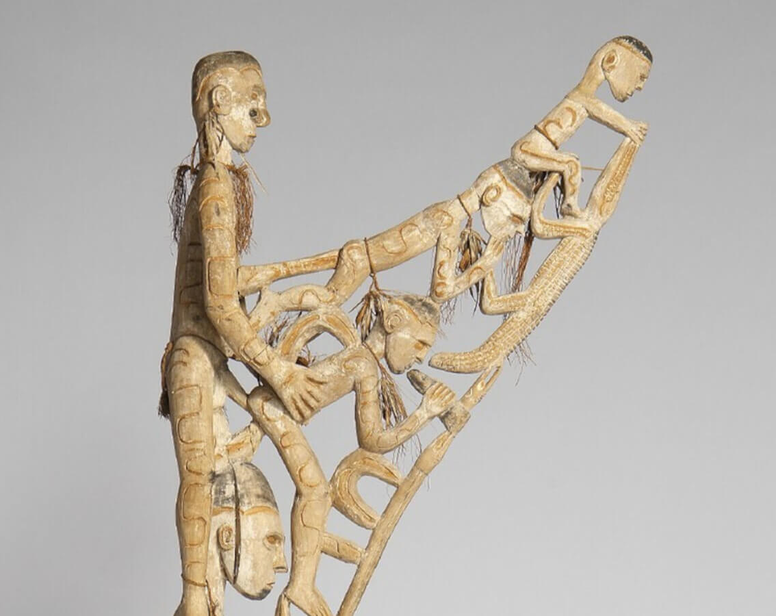 Here the contrast with Papua New Guinea becomes clear. In the southwest of the island, among the Asmat people, a vital and uninterrupted tradition of monumental woodcarving still existed around 1890. The famous bisj poles were not decorative objects, but ritual sculptures created for a culture that was very much alive.
