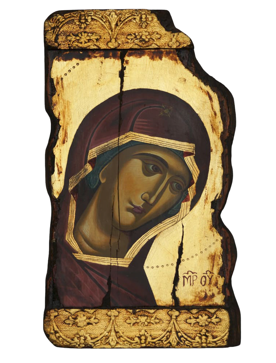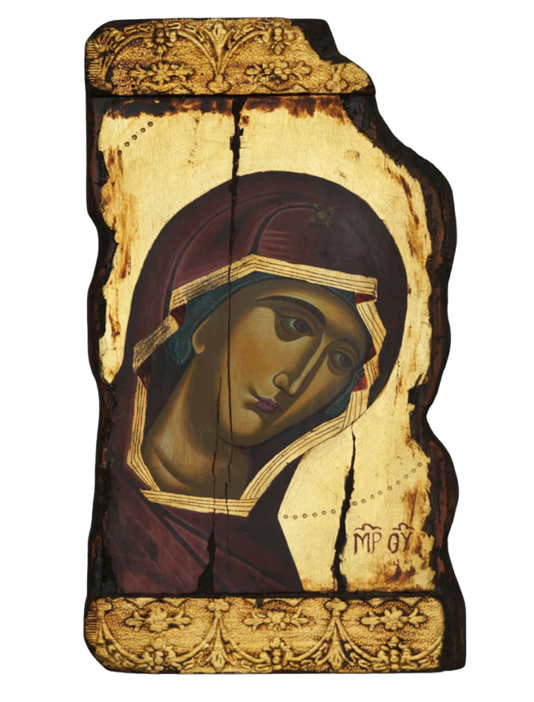 I personally prefer a cheaper icon of Maria found on another website, painted on a beautifully weathered wooden plank. Above and below the painting, fragments of classical ornamentation are still visible, finished with gold leaf. Price: 198 euros.