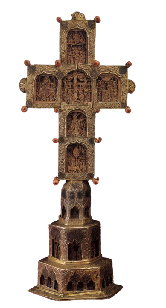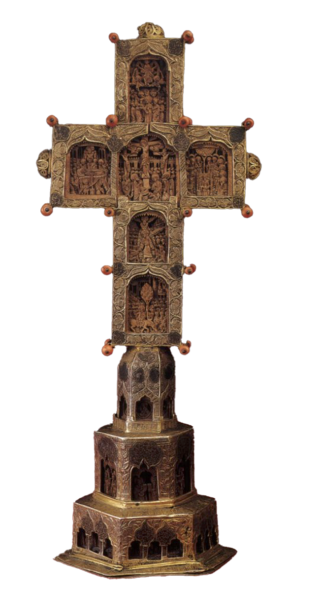 A finely carved wooden cross from Mount Athos, showing miniature relief scenes.