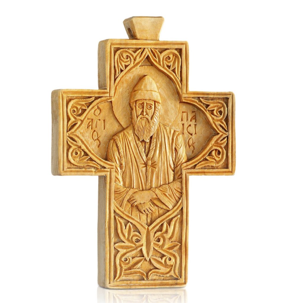 A modern wood-carved cross from Mount Athos, offered for sale by the monastic community.