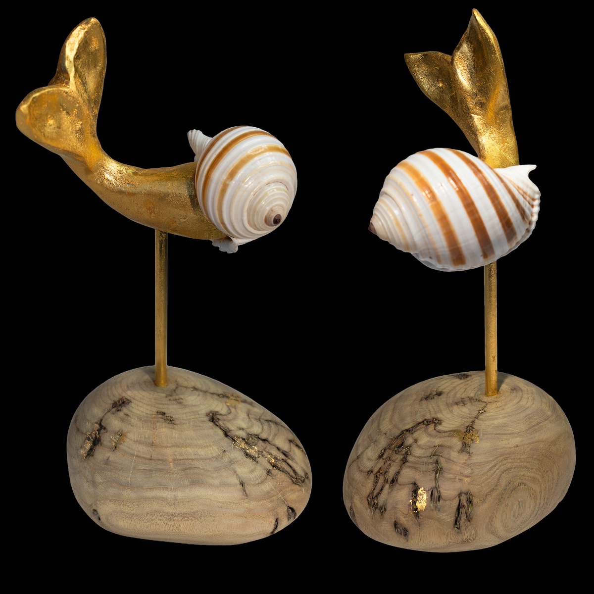 From a rough piece with a branch, I carved a wooden stone to serve as the base. While I was gilding the tail, a tiny flake fell onto the base and would not come off. In fact, it felt right. It visually connects the base and the sculpture. Better to leave it as it is.