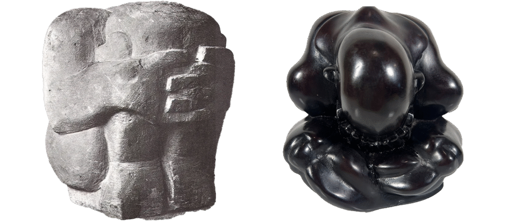 Ze inspireerden Derain om in 1907 zijn ‘Croucing Figure’ te maken, direct gehakt uit de kalksteen van de trappen van het huis van zijn ouders in Châtou, Frankrijk. Zijn in elkaar gedoken man is bijna vierkant, alsof hij in een kubus moet passen. Zijn voeten zijn stomp, net als die van de God van de Azteken: Xochipilli (toenertijd te zien in het British Museum). De proporties van de zittende figuur zijn echter weer ‘Afrikaans’.