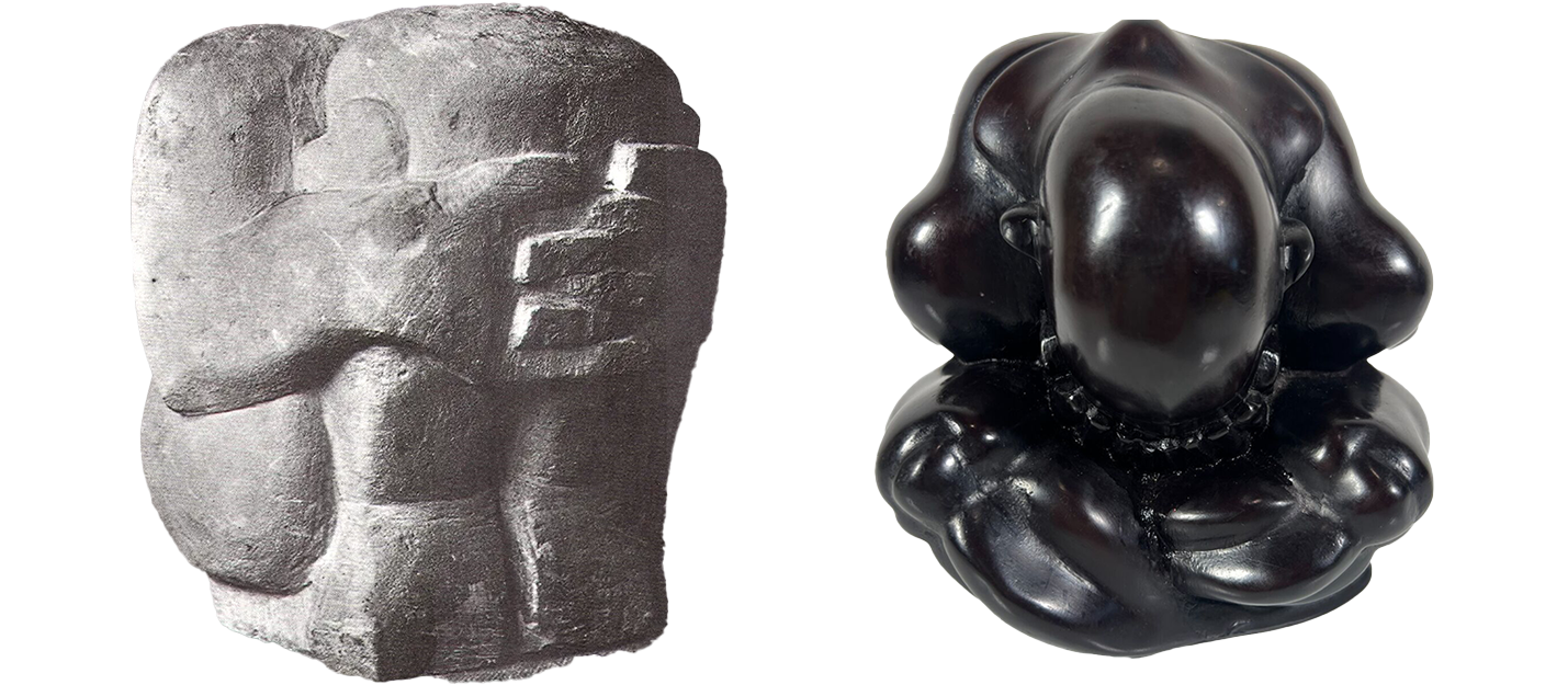 Links de ‘Crouching Figure’ van André Derain, rechts de houten ‘Huilende Monnik’ uit Bali.