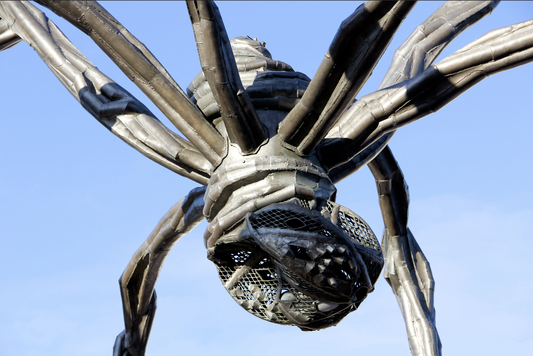 De kop van een van de Mamam-installaties van Bourgeois: reusachtige spinnen, die marmeren ‘eieren’ onder zich dragen.