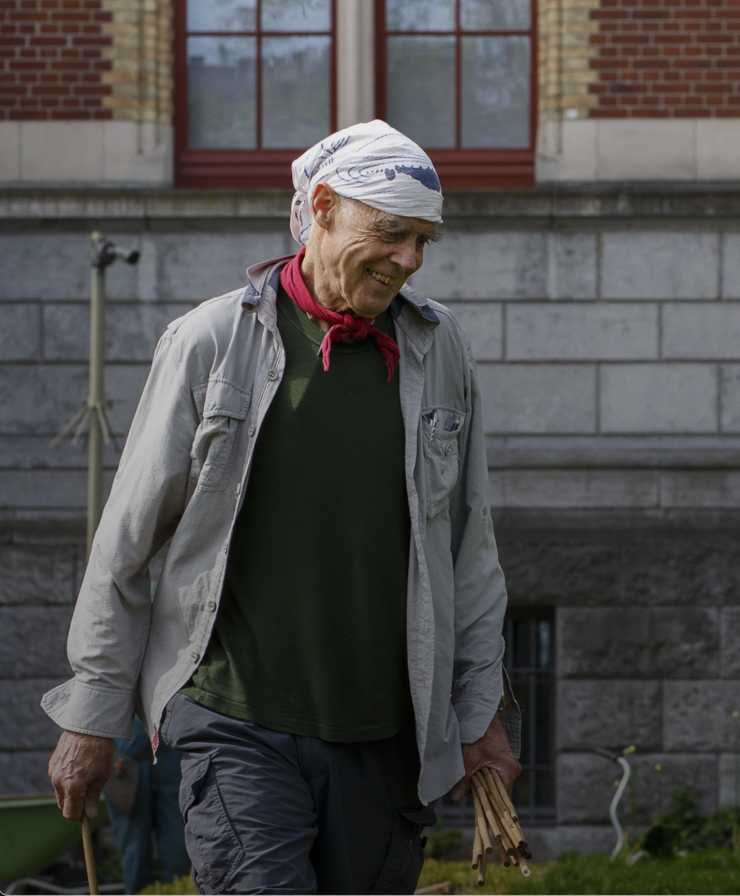 Richard Long in 2023 aan het werk in de tuinen van het Rijksmuseum in Amsterdam.