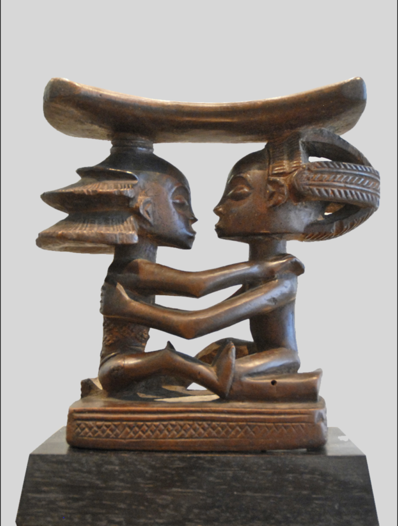 Luba-houtsnijwerk omvat caryatid-stoelen, reliëfsculpturen en ceremoniële objecten. Ze tonen verfijnde compositie en ritueel leiderschap, vaak met vrouwelijke symboliek. Heerlijk om op zo’n romantisch hoofdbankje in slaap te vallen.