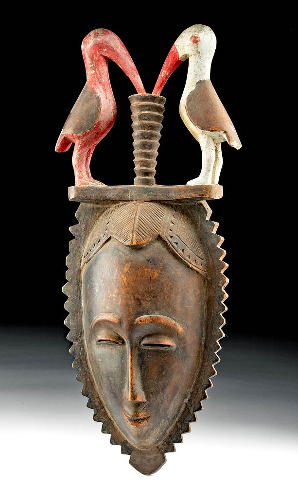 Specifiek de witte maskers van de Ngil‑maatschappij, gebruikt bij initiatierituelen en om kwade invloeden te weren. Ze vormen een hoogtepunt van Fang‑esthetiek en ritueel design. Uit duizenden herkenbaar deze langwerpige hoofden. Prachtig gestileerd: hoe de neus doorloopt in de mond, zonder dat dit storend is.