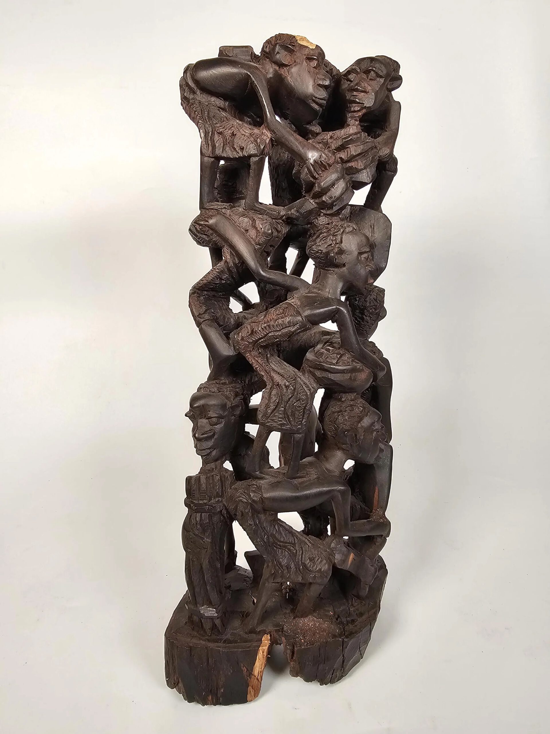 De Tree of Lifesculptuur is een traditioneel verhalend en symbolisch object waarin menselijke figuren uit één stam of familie uit de stam van een boom lijken te groeien. Ze zijn vaak uit één stuk stam ebbenhout (Afrikaans blackwood) gesneden — een houtsoort die in Oost-Afrika overvloedig is en geliefd bij Makonde-snijders vanwege zijn dichtheid en diepe kleur. Ik hou van deze verhalende snijstijl; het was bovendien mijn eerste Afrikaanse beeld dat ik kocht, gesneden uit een nogal kromme tak ebbenhout, waar ook het witte spinthout nog steeds zichtbaar is. Het zorgt voor een opvallend contrast.