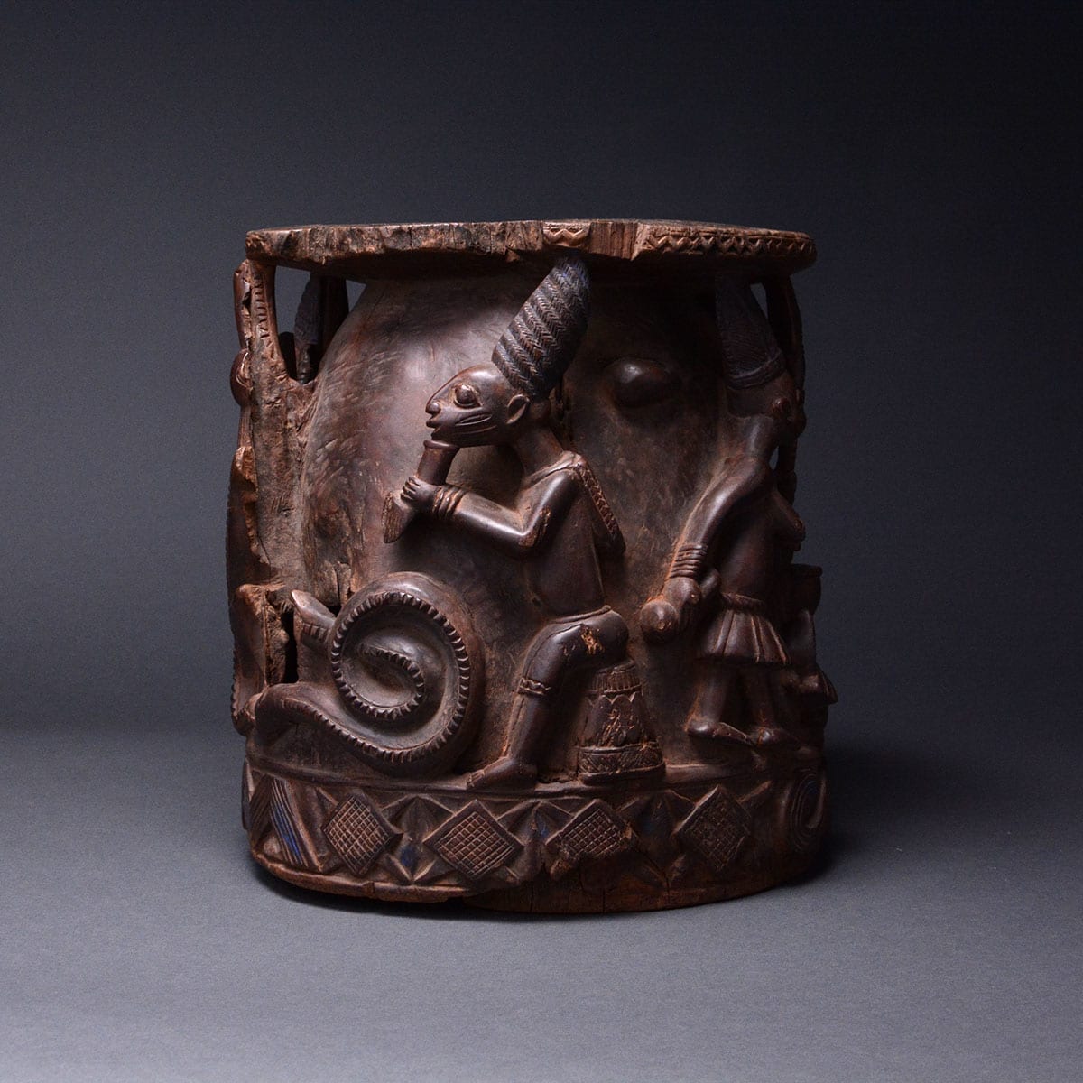 Yoruba-houtsnijkunst omvat koninklijke, religieuze en initiatieobjecten, waaronder complexe helm‑maskers (Magbo) die de sociale en religieuze hiërarchie visualiseren. Maar ook gebruiksvoorwerpen werden fraai gesneden, zoals dit stoeltje. De Yoruba-kunstenaars werken niet alleen in hout en zijn ook vandaag nog invloedrijk.
