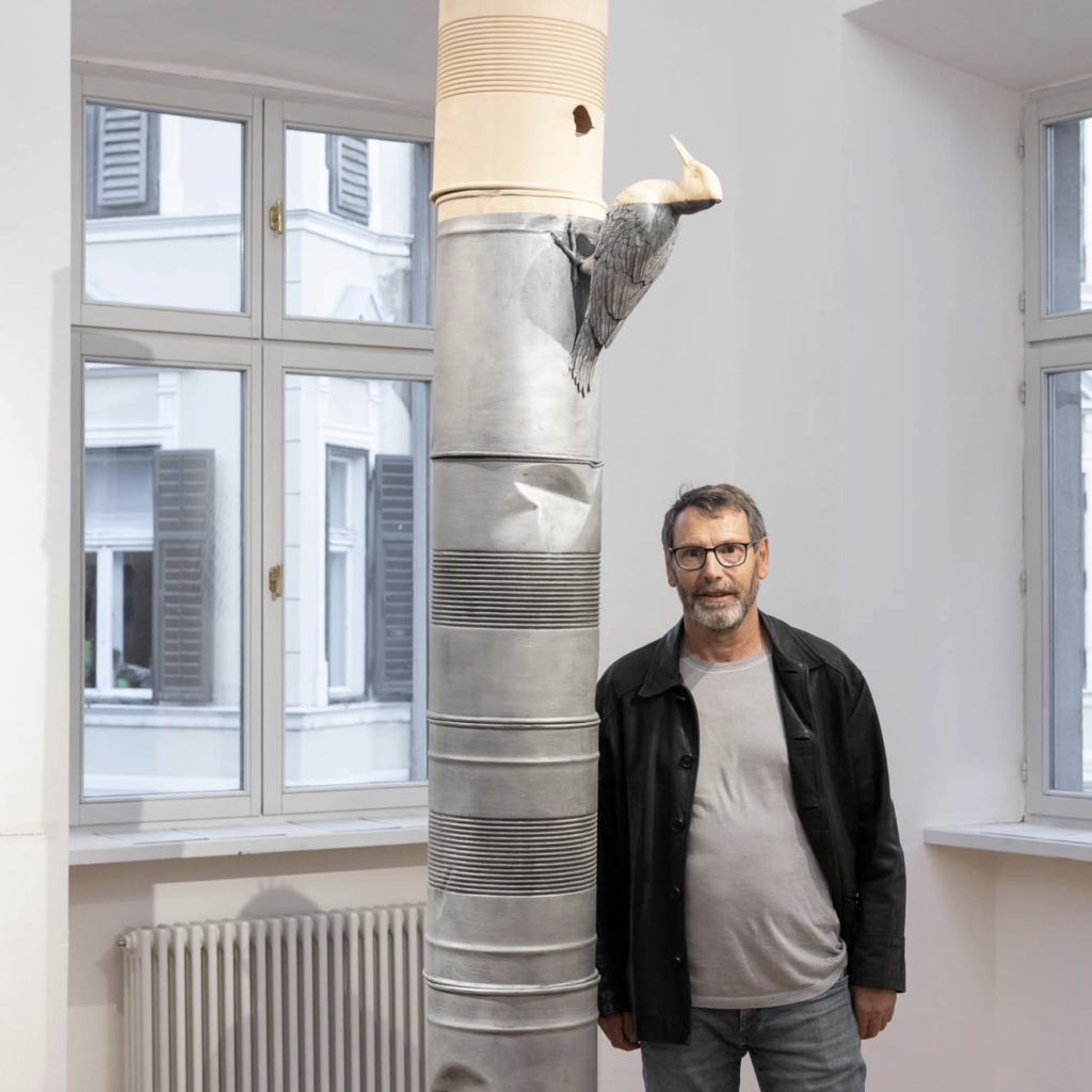 Willy Verginer poseert bij een beeld waar een specht een gat in een oliedrum pikt.