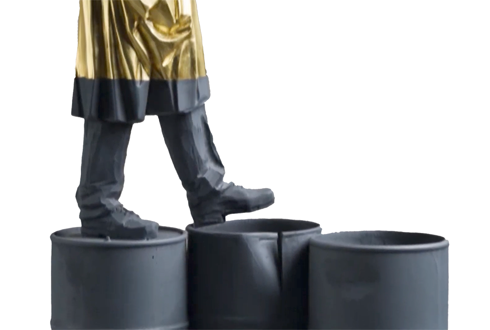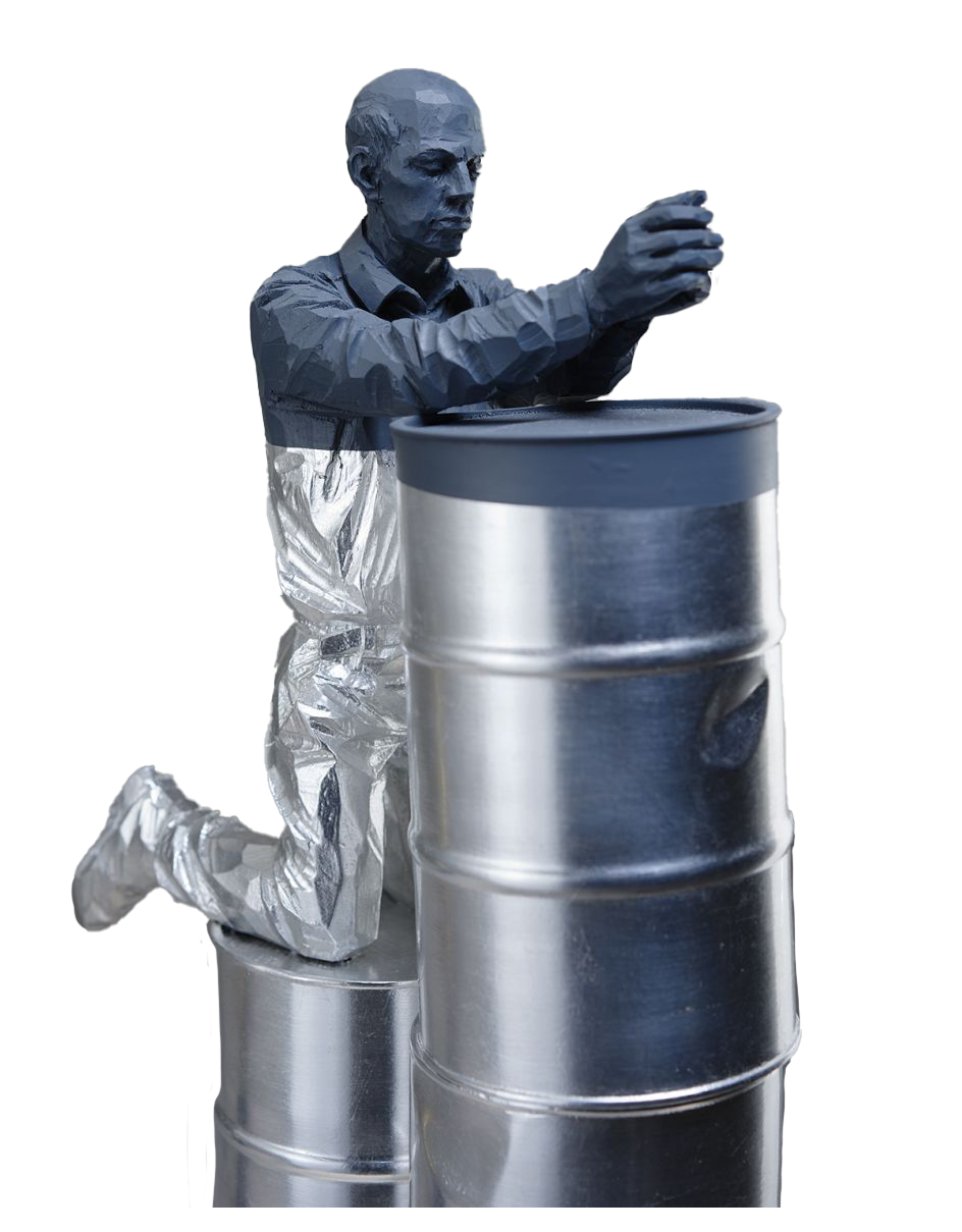 Willy Verginer bidt op een olievat, een beeld met een kraakheldere ecologische boodschap.