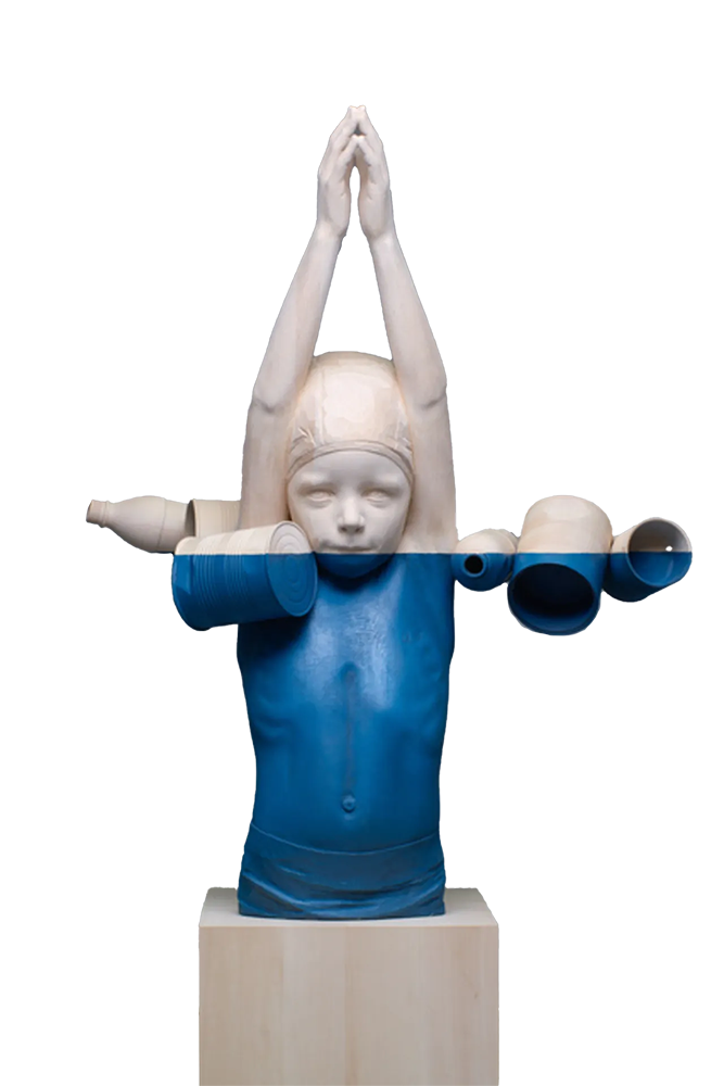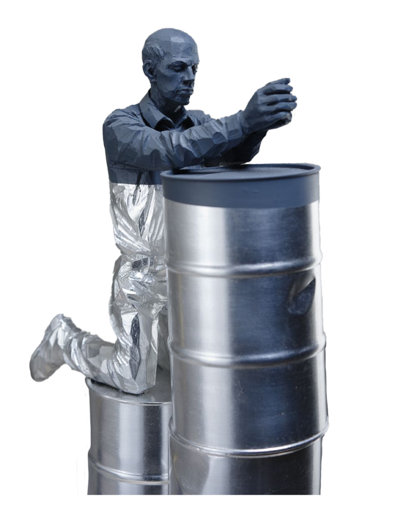 Willy Verginer bidt op een olievat, terwijl een kleurvlak de stijgende zeespiegel aangeeft. De oliedrums keren terug in tal van andere sculpturen. Een kind kan niet meer zorgeloos in het water spelen door alle drijvende vaten en andere rommel om zich heen. Een jong hert staat verweest op een oliedrum. Een specht pikt een gat in zo’n vat. Een man verdrinkt erin.