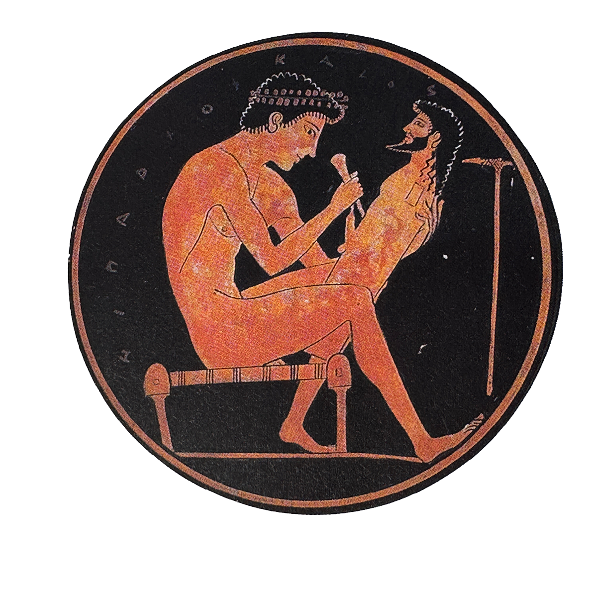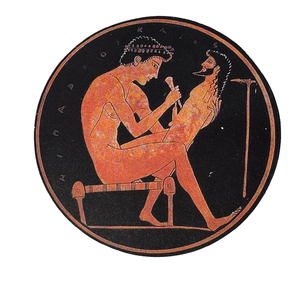 De oudst bekende afbeelding van een beeldsnijder in hout is Grieks. We zien een naakte man, zittend, met een borstbeeld tussen zijn knieën geklemd. De voorstelling is aangebracht aan de binnenzijde van een drinkkopje en dateert van circa 520 tot 500 voor Christus.